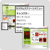 「カスタムスクリーン」とは、ディスプレイ上の壁紙やインデックスメニュー、アイコン、電池マーク、電波マーク、メール画面など一連のテーマをカスタマイズできる“着せ替え”コンテンツです。お気に入りのキャラクターにテーマをそろえたり、素材感やデザインを統一してあなたの携帯をおしゃれに演出できます。