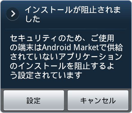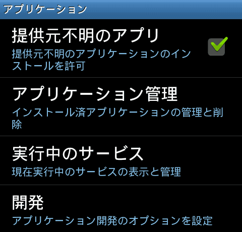 ※上記<3>の操作は、端末のメニューボタン>設定>アプリケーションからも行えます。インストール後は、提供元不明アプリの許可チェックを外すことをお勧めします。